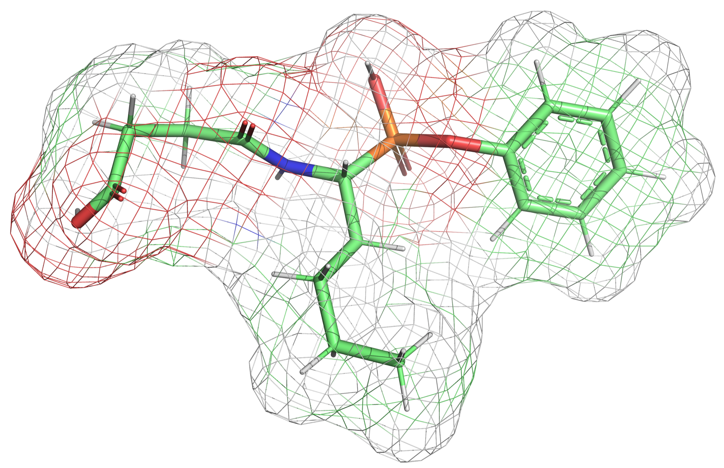 A visualization of a ligand generated by NucleusDiff for a particular protein target. This ligand greatly decreases atomic collisions and increases binding affinity. (Scroll to the next image to see a ligand generated by another machine-learning model.)